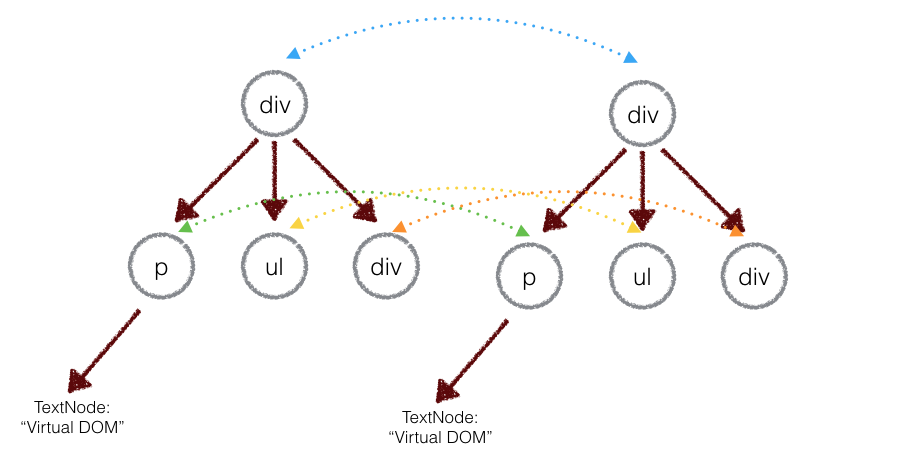 但是可以用新渲染的对象树去和旧的树进行对比,记录这两棵树差异。记录下来的不同就是我们需要对页面真正的 DOM 操作,然后把它们应用在真正的 DOM 树上,页面就变更了。这样就可以做到:视图的结构确实是整个全新渲染了,但是最后操作DOM的时候确实只变更有不同的地方。