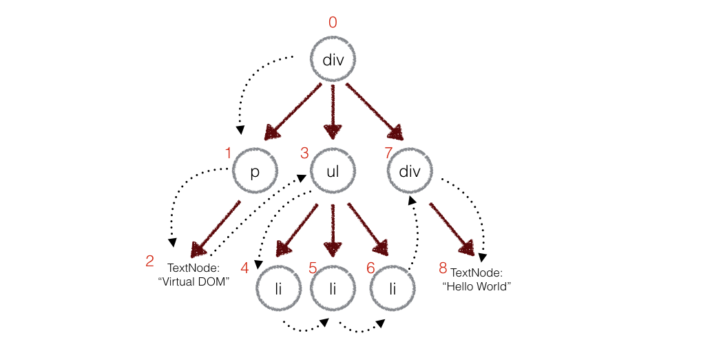 currentNodeIndex = (leftNode &&leftNode.count) // 计算节点的标识? currentNodeIndex +leftNode.count+1: currentNodeIndex +1dfsWalk(child, newChild, currentNodeIndex, patches) // 深度遍历子节点