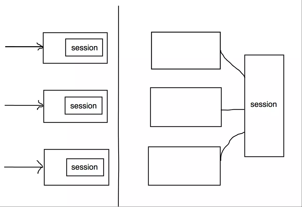上图中的关于session独立部署的方式有很多种,可以是一个独立的数据库服务,也可以是一个缓存服务(redis,目前比较常用的一种方式,即使用Redis来作为session缓存服务器)。