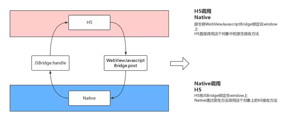 在 JSBridge 的设计中,可以把前端看做 RPC 的客户端,把 Native 端看做 RPC 的服务器端,从而 JSBridge 要实现的主要逻辑就出现了:通信调用(Native 与 JS 通信) 和 句柄解析调用。(如果你是个前端,而且并不熟悉 RPC 的话,你也可以把这个流程类比成 JSONP 的流程)