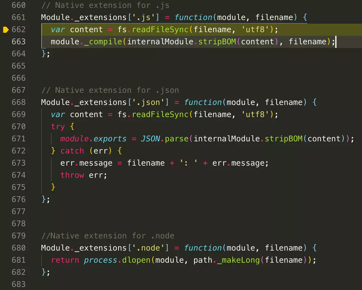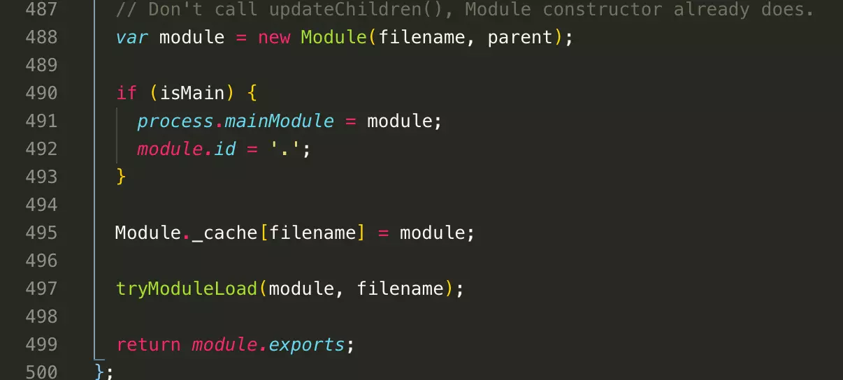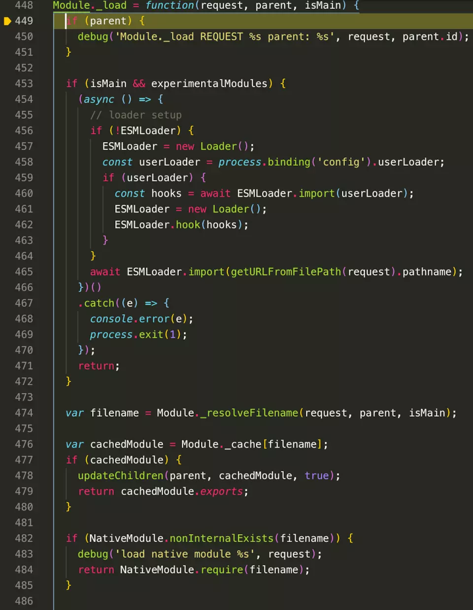 return Module._load(path,this,false)path为我们传入的模块路径,this则是这个模块,false则不是主要模块,主要模块的意思是,如果a.js加载了b.js,那么a.js是主要模块,而b.js则是非主要模块。