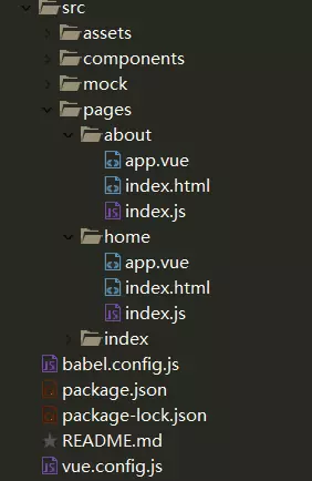 每一次新开的页面都在pages里面起一个文件夹,文件夹名字就是H5页面名字,入口文件是文件夹的index.html和index.js。