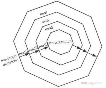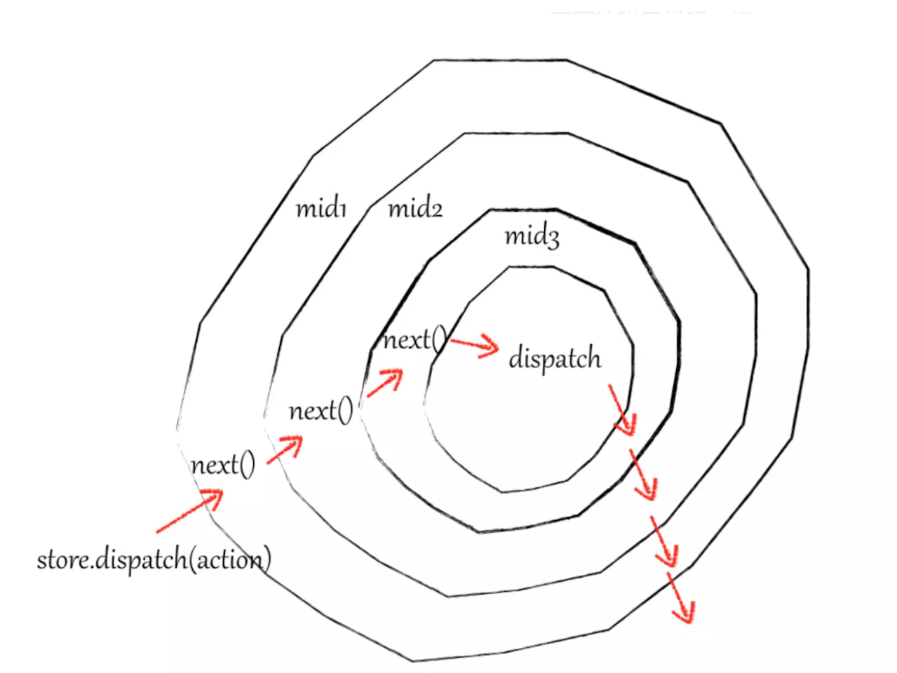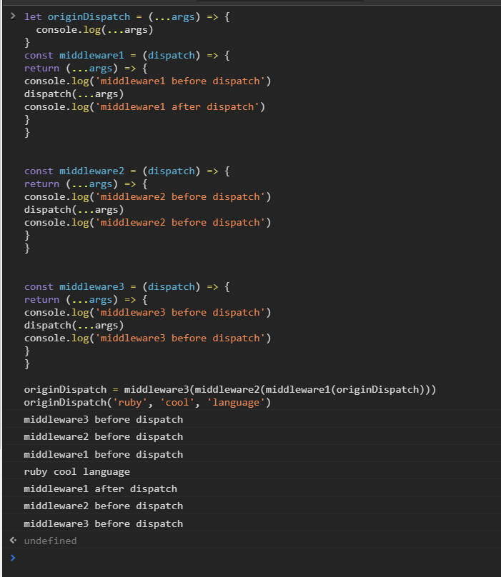 middleware1(originDispatch)当做一个整体,middleware2(middleware1(originDispatch))中的middleware2返回一个函数,等着接受...args;当compose(middleware2, middleware1)(originDispatch)('redux', 'is', 'cool'),...args为('redux', 'is', 'cool')。