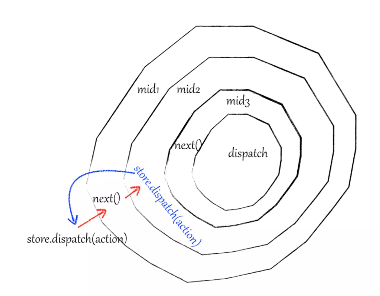 compose(middleware2, middleware1)返回(args) => middleware2(middleware1(args));compose(middleware2, middleware1)(originDispatch)返回middleware2(middleware1(originDispatch))- 将